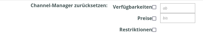 Einstellungen/Channel-Manager Um eine bestimmte Schnittstelle zurückzusetzen, wählen Sie diese im Abschnitt „Schnittstellen“ aus. Es erscheinen die Detaileinstellungen für diese Schnittstelle. Wählen Sie bei „Schnittstelle zurücksetzen“ aus, was Sie zurücksetzen wollen (Verfügbarkeiten, Preise und/oder Restriktionen). Optional können Sie auch einen Datumsbereich auswählen, der zurückgesetzt werden soll. (wenn Sie die Datumsfelder leer lassen, werden alle buchbaren Tage zurückgesetzt.)
